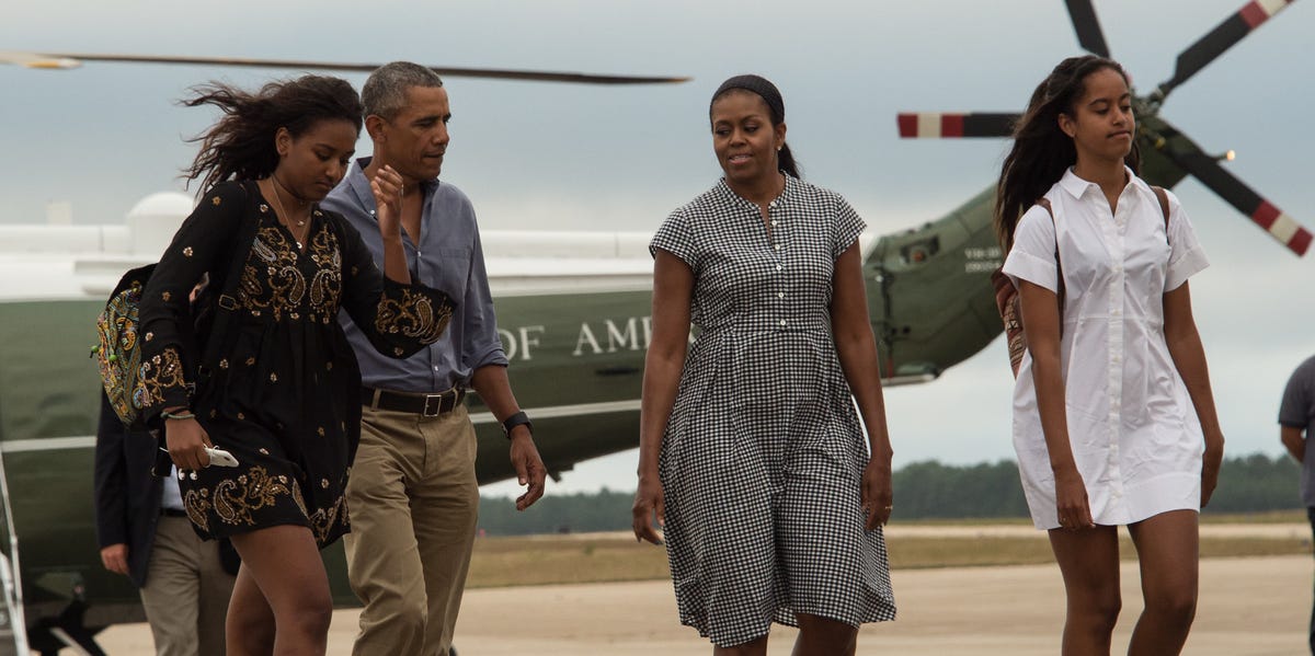 In the photo, they are wearing stylish yet casual loose-fitting outfits. Barack is wearing a white button-down shirt with an open neckline and a khaki shirt. Michelle is wearing cream slacks and a white cami with a yellow and green floral pattern, over which she wears a seafoam green cardigan. Malia is wearing an asymmetrical pale yellow dress, while Sasha is wearing a white lace skirt, red halter top, and jean jacket.