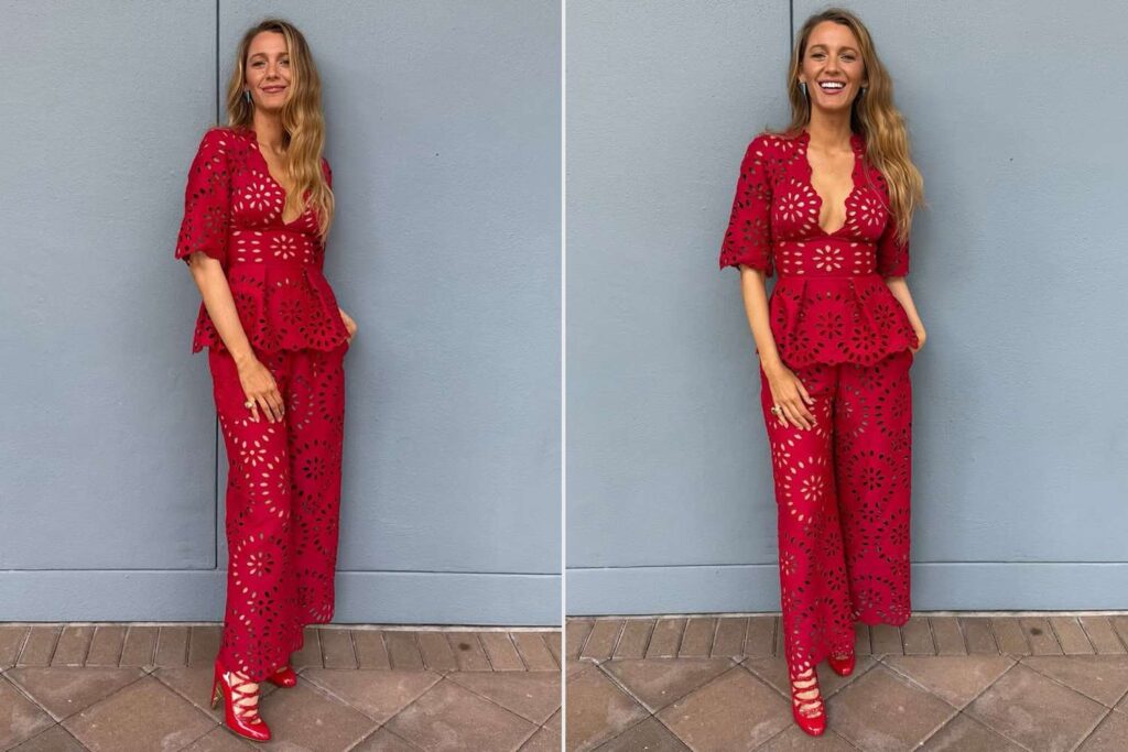 The Simple Abol actress wore the Elie Saab Broderie Peplum Top in Red. It’s on sale for $1,170. She paired it with matching Broderie-Anglaise Palazzo pants. Lively’s Vintage Chanel Red Patent Leather Strass Backle Heels complete the look.
