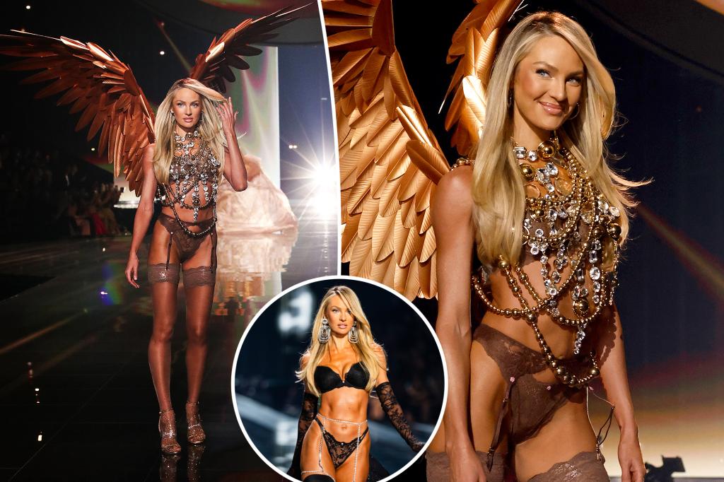 Candice Swanepoel wears golden wings on the Victoria’s Secret Fashion Show 2025 runway