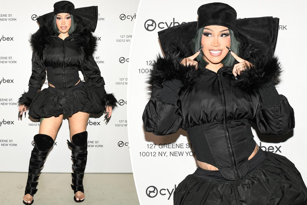 The rapper showed off her post-baby figure in a dramatic black corseted puffer jacket with faux fur trim, paired with a matching bubble-hem miniskirt. Cardi B/Instagram