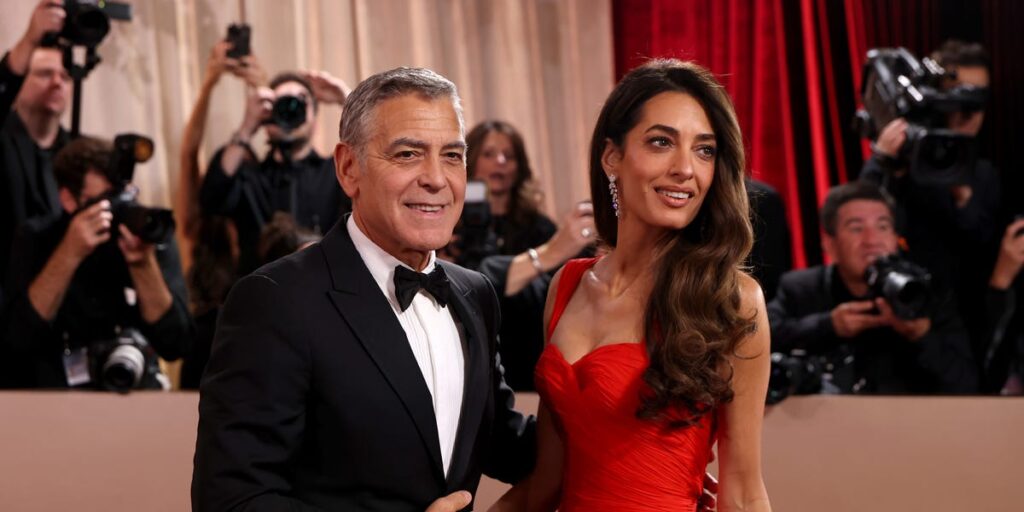 George and his wife Amal Clooney appeared hand in hand on the red carpet. George looked sharp in a classic black tuxedo. Amal complemented him in a form-fitting red dress with Cartier jewellery.