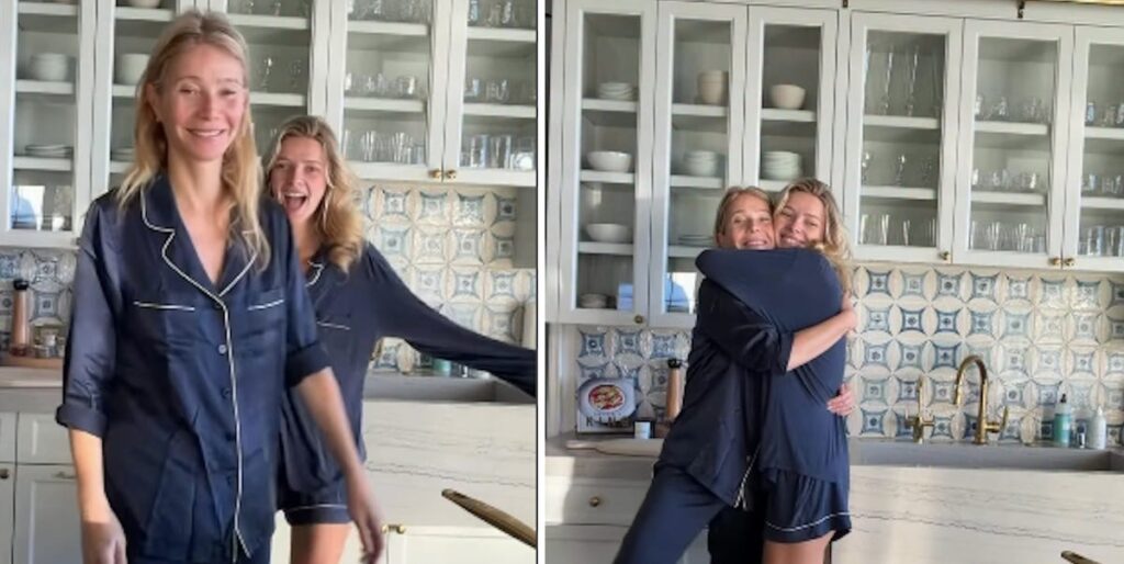 On Saturday, Gwyneth Paltrow posted a new video montage to Instagram that included shots of her 21-year-old daughter Apple Martin. The mother-daughter duo hung out in the actress’ kitchen and shared a hug before Martin started cooking for the family. They also shared a look, wearing matching navy pajama sets with white piping.