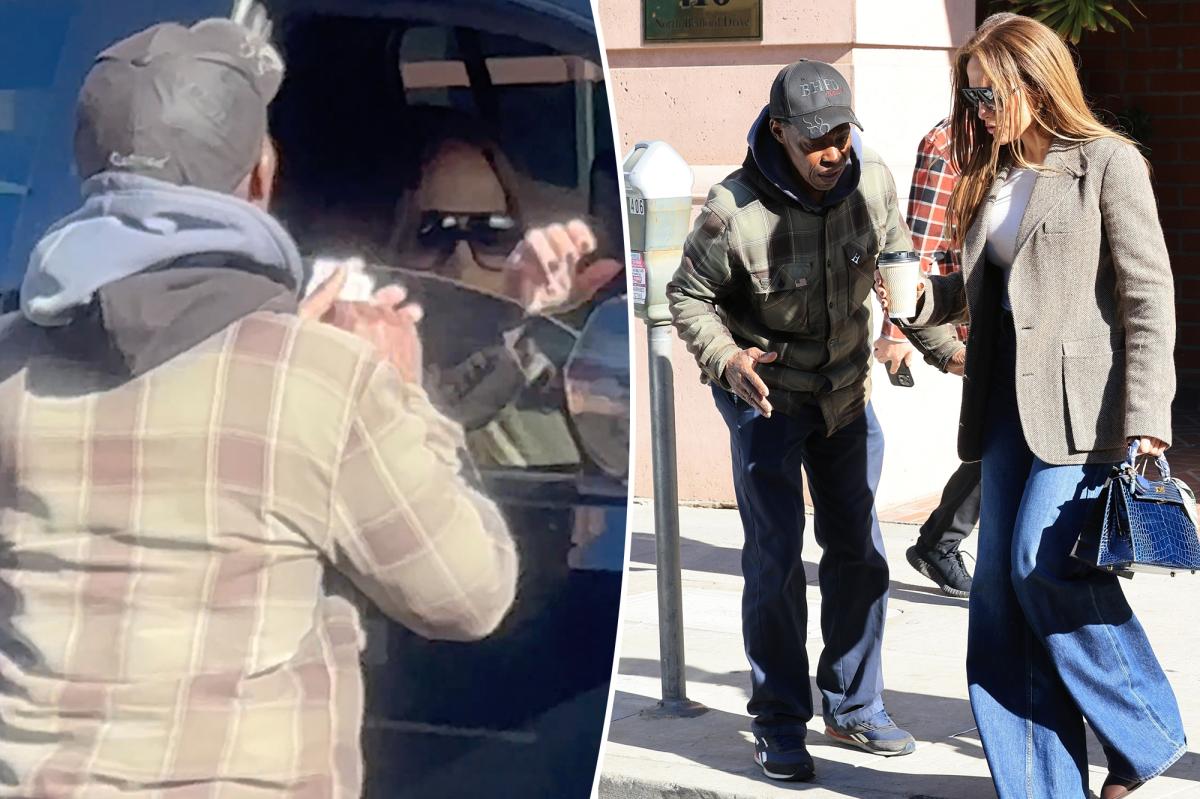 Looking chic in blue jeans, a white top, heels and a brown blazer, Lopez walked past him and got into her Cadillac Escalade.