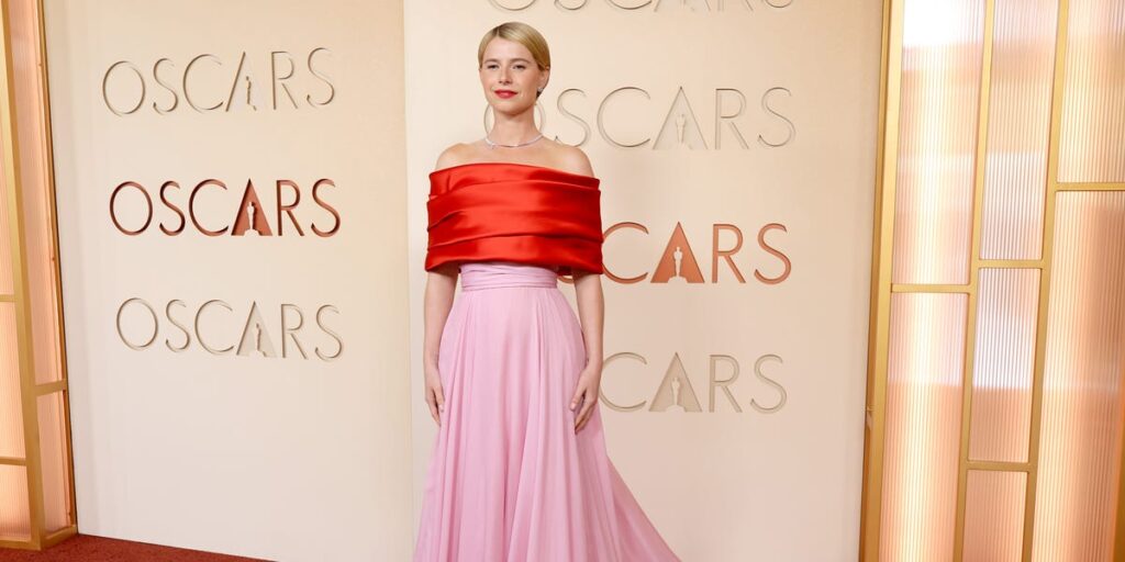 Hamnet’s Jesse Buckley, who just won Best Actor earlier this month, arrived at the Academy Awards in one of the best looks of the entire 2026 awards season. The Best Actress nominee wore a red and pink off-the-shoulder dress by Matthew Blasey for Chanel, which was accessorized with Chanel high and fine jewelry. She wore matching red lipstick and kept her blonde hair tucked neatly behind her ears.