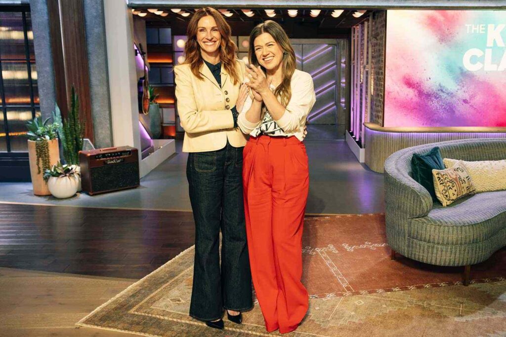 Last week, the Notting Hill star, 57, visited The Kelly Clarkson Show in a denim style that is making a comeback. She showed up wearing what appeared to be $325 flared jeans by British brand Me + Em. It had prominent patch pockets for a slightly retro feel, and the dark wash matched perfectly with her blue blouse and tan blazer, also from the brand.