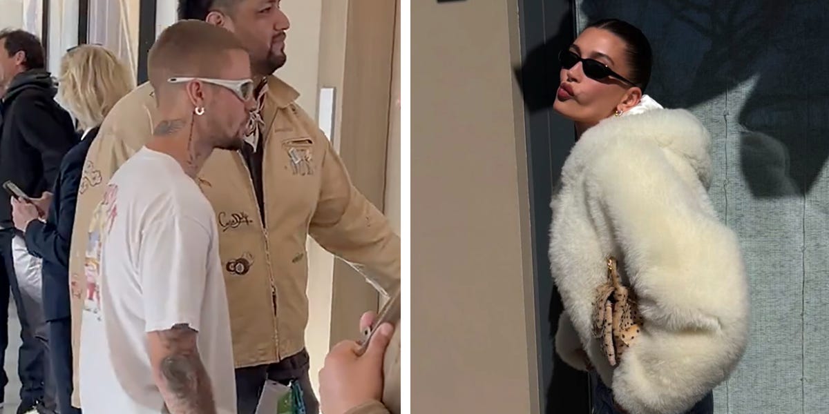 Justin and Hailey Bieber wore matching white looks at the 2026 Super Bowl.