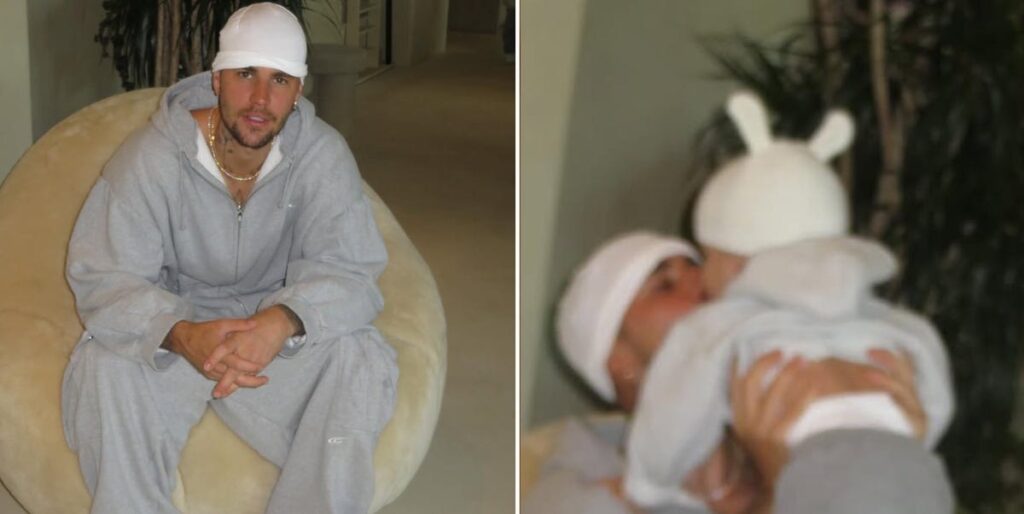 In Jack’s image, the toddler is dressed almost identically to his father, wearing a gray hoodie and sweats. Instead of a beanie, she wears a white hat with bunny ears. In the buried photo, Justin picked Jack up, held him up to his face and kissed him.