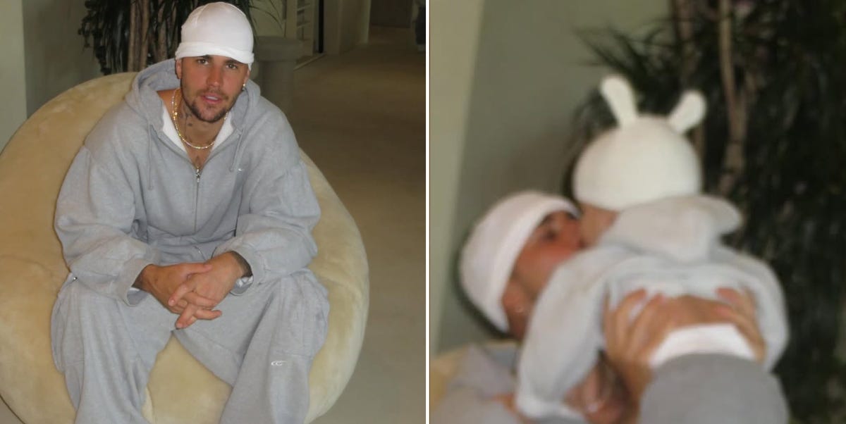 On Wednesday, Justin Bieber shared new photos to Instagram on a merry-go-round, including a surprise shot of his son Jack Bruce Bieber. In many of the photos, Justin wears a gray hoodie, paired with sweatpants and a white beanie. He shared multiple photos of himself posing in a plush, plush white chair, then shared one photo of himself with Jack.