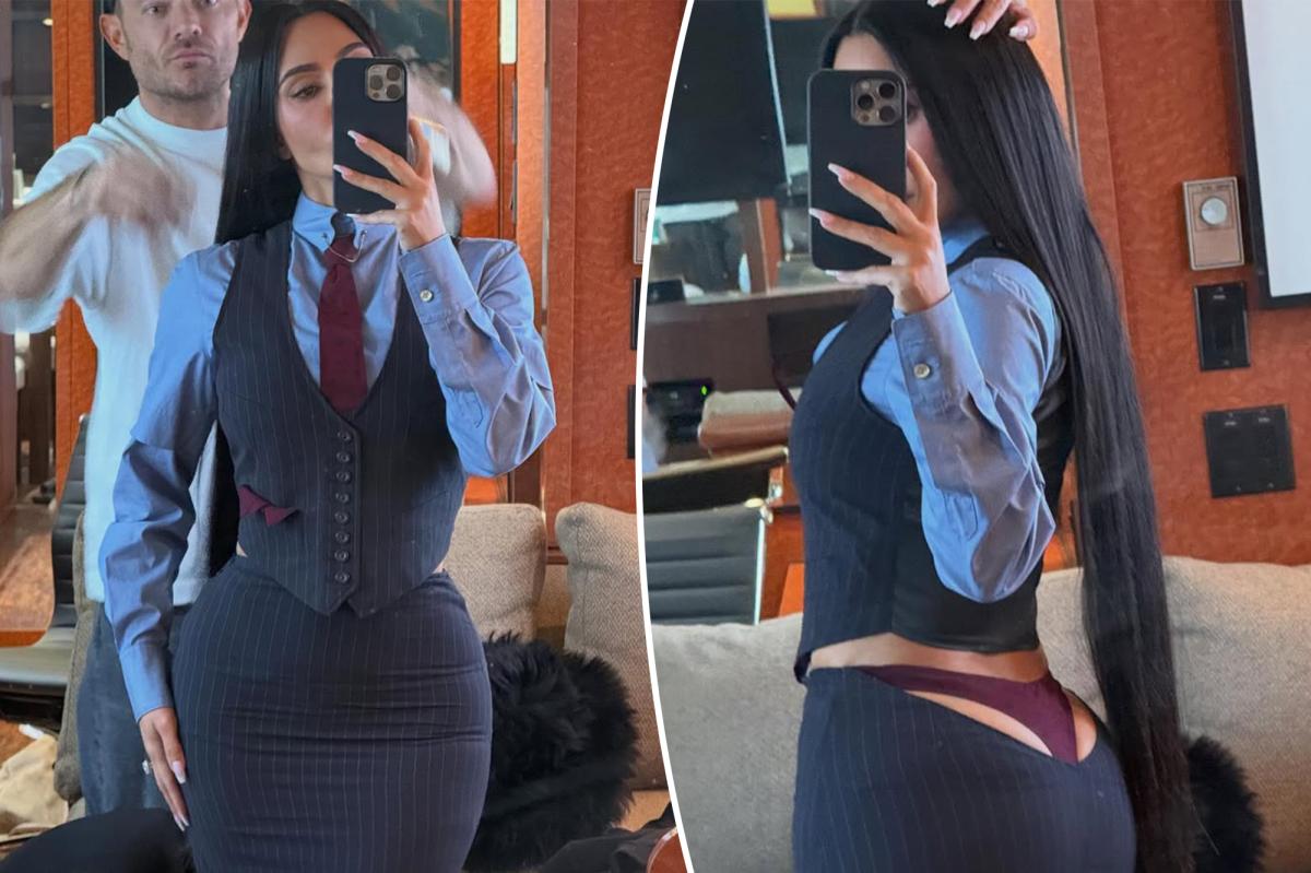 In one image, Kardashian appears to be wearing a classic pinstripe outfit with a tight pencil skirt, button-down shirt, waistcoat, and tie.