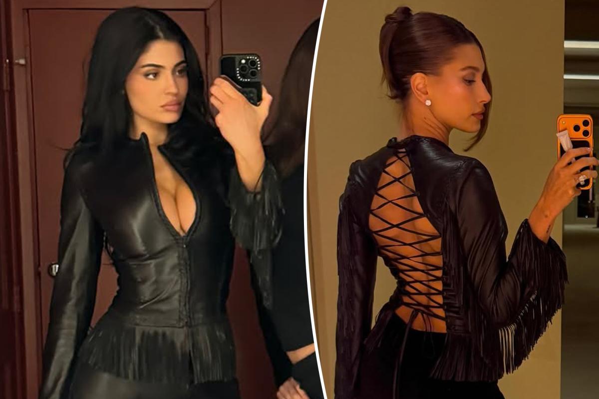 Kylie Jenner borrows Hailey Bieber’s backless Versace leather jacket