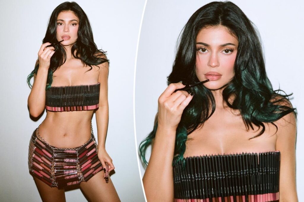 Jenner’s latest look features a bandeau top made of pencil and a skirt made of shiny tubes held together by chain mail. Her brown hair flows down to her shoulders, with a hint of green showing at one of its ends.
