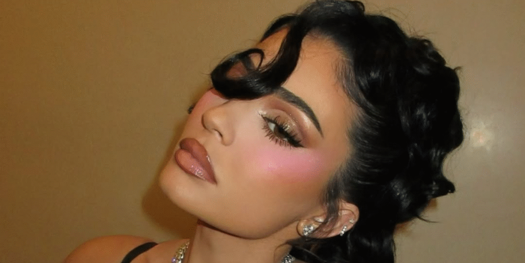 For the beauty look, Jenner wore her hair in a voluminous updo, curls framing her face, and her makeup included a nude gloss lip contoured with dark liner, pink blush, and plenty of metallic eyeshadow.
