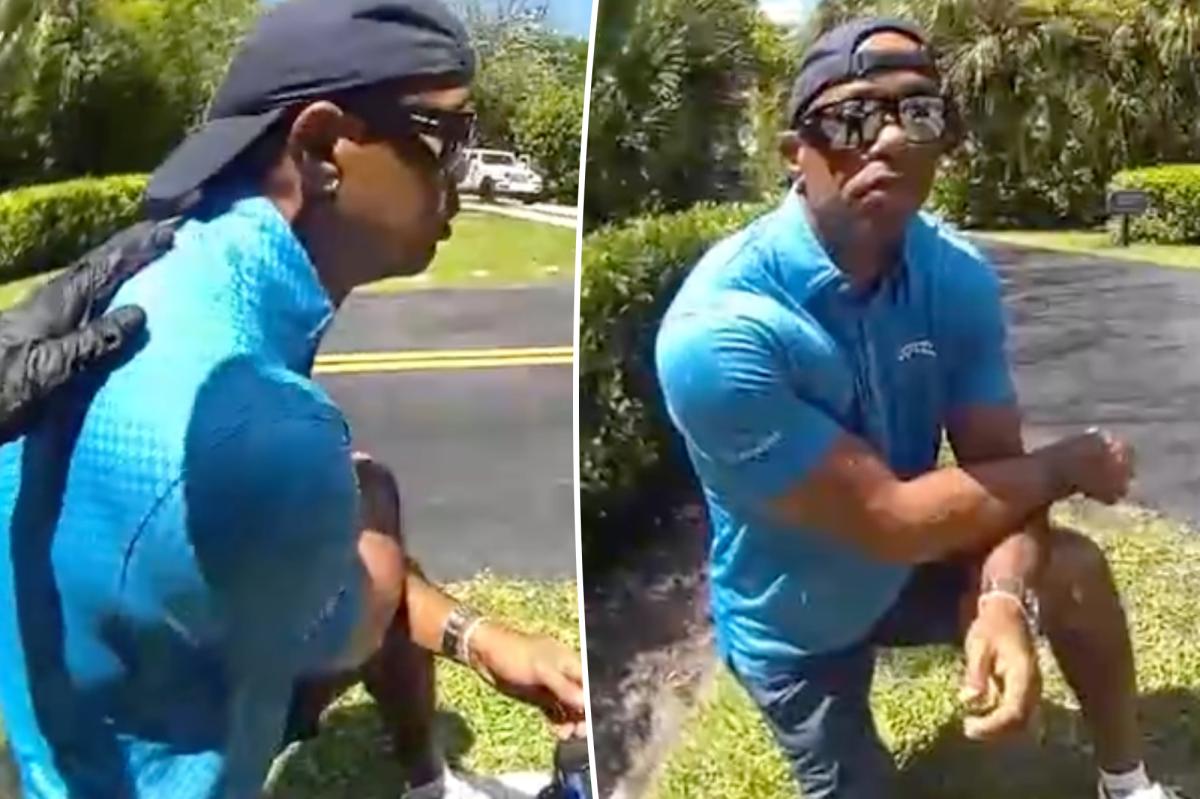 Shocking footage shows the great golfer, 50, wearing sunglasses and a backwards hat, kneeling in the grass as he is questioned by police.