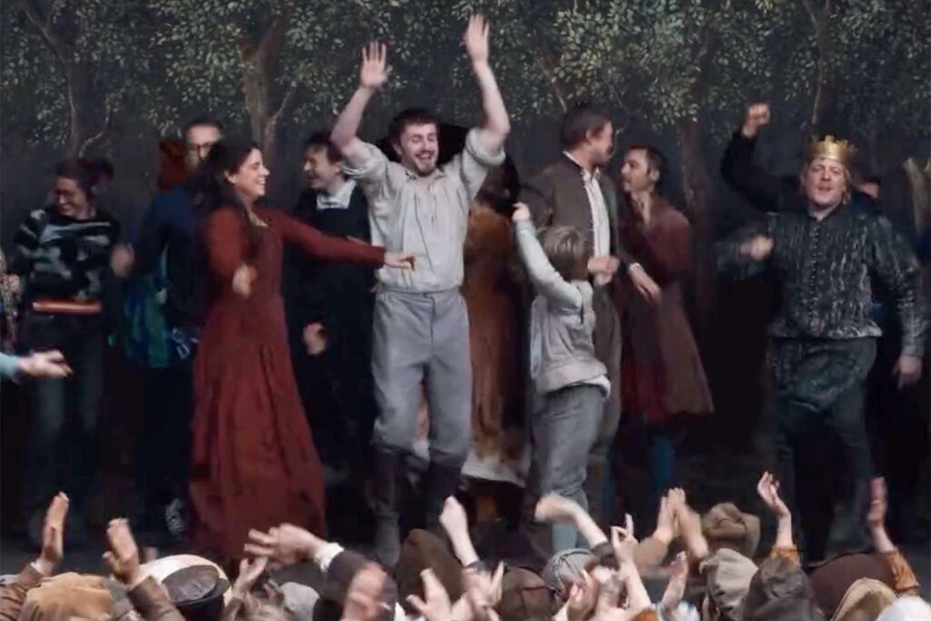 The clip begins with Mescal and Buckley carrying their young co-star Jacobi Jupe on stage as Rihanna’s 2011 hit “We Found Love” blares, as a crowd of extras and background actors on a Globe Theater movie set cheers. Joe Alwyn, Noah Jupe, and other actors from the production soon join them on stage, and the entire cast and crew, including director Chao in the crowd, participate in an anachronistic, dance-filled moment while dressed in 16th-century movie set costumes.