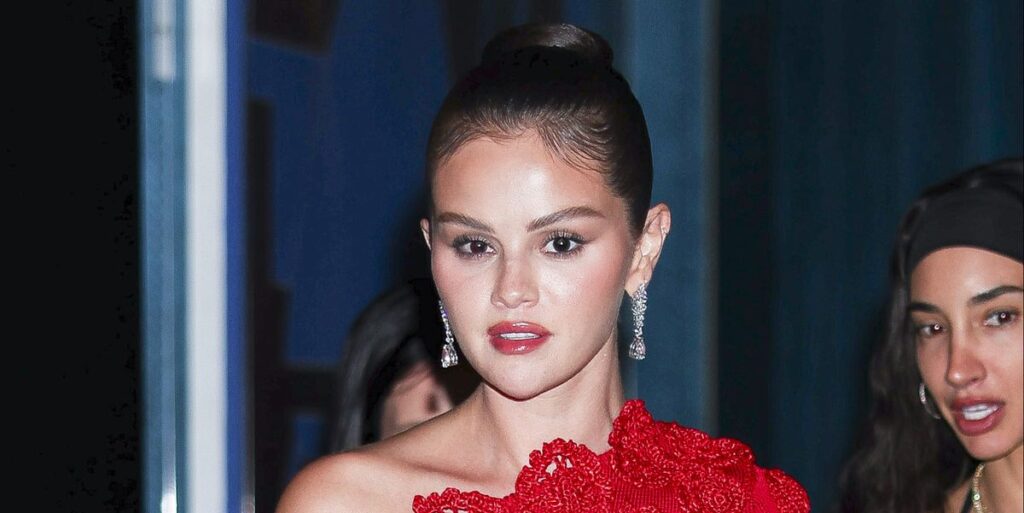 On Friday, Selena Gomez sent her followers into a frenzy with an Instagram Story that appeared to be from the set of a new music video. In the image, Gomez wears a black sleeveless leather tunic with a turtleneck and visible seams that form a pattern on the torso. Her hair is side-parted and swept back in a ‘wet’ style, and her makeup is sultry with smokey eyes and dark red lipstick outlined in black.