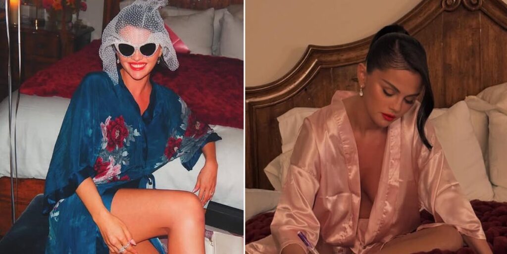 In another image, Gomez wears a pale pink pajama set with a top-open and a pair of diamond drop earrings while sitting in a hotel bed. Her hair is cleaned with elegant chignon and she writes her vows on a swing, so she leans against her writing pad and looks serious.
