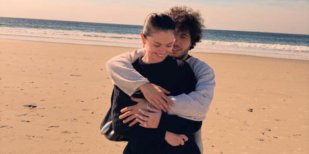 Outside is another photo of Gomez with a swing, this time standing on the beach. Gomez is smiling in front. Blanco is behind her and pulls her close in a warm embrace. She is all black, with a marquise diamond engagement ring visible on her left hand. He is wearing a gray sweatshirt.