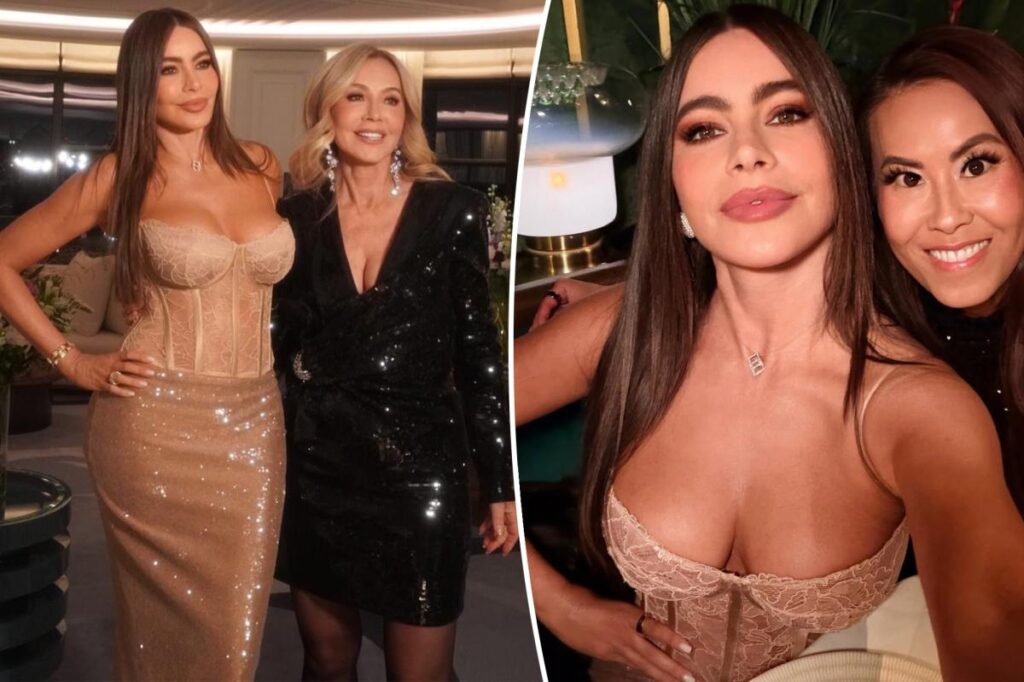 Sofia Vergara wears sheer lace corset and sequin skirt in London for Anastasia Soare’s birthday