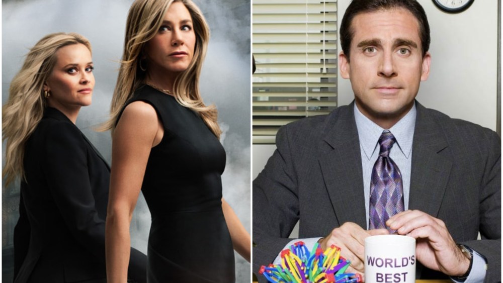 Above: Reese Witherspoon and Jennifer Aniston from Apple TV’s “The Morning Show” and Steve Carell from “The Office.”