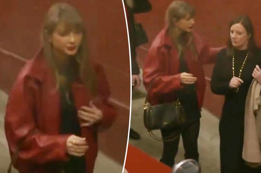 Taylor Swift wears festive red bomber jacket at Chiefs vs. Broncos game on Christmas