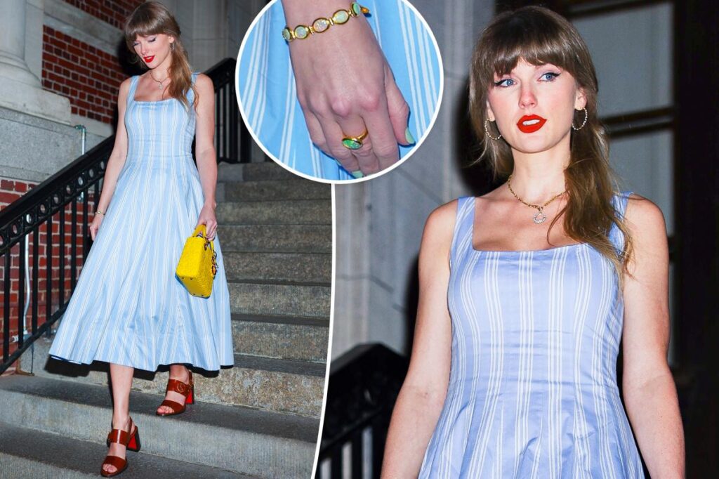 Darlene de Cedre’s suite originally consisted of two gold bracelets, matching drop earrings, and a ring, but Swift only wore one bracelet and matching ring on her night out.