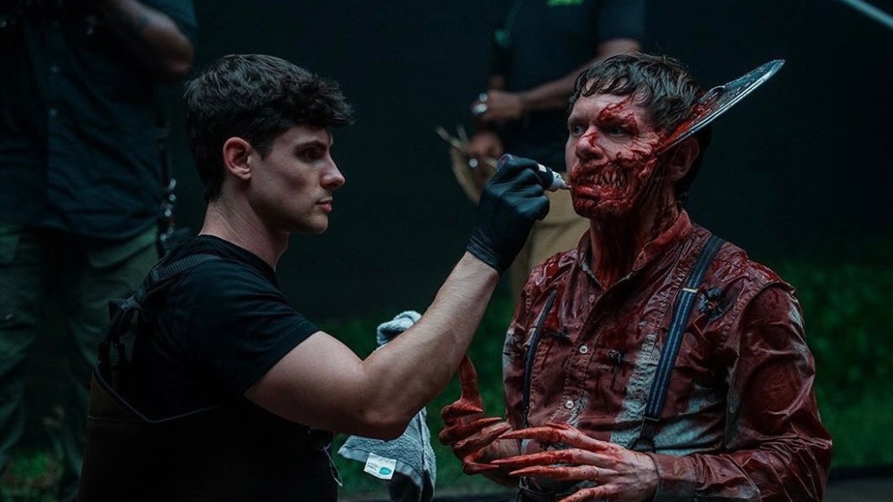 To perform this sequence, Fontaine created a fiberglass plate with a magnet attached to Remick’s head, into which a fake guitar resonator would click. “He has this plate on his head. It’s hidden by prosthetics and a wig, so it looks like it’s just a head, but there’s a whole structure underneath it. There’s a tube that pumps smoke and blood out of it,” Fontaine said.