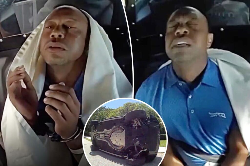 Tiger Woods looked frustrated as he was handcuffed in a police car after being arrested for drunk driving after a rollover accident.
