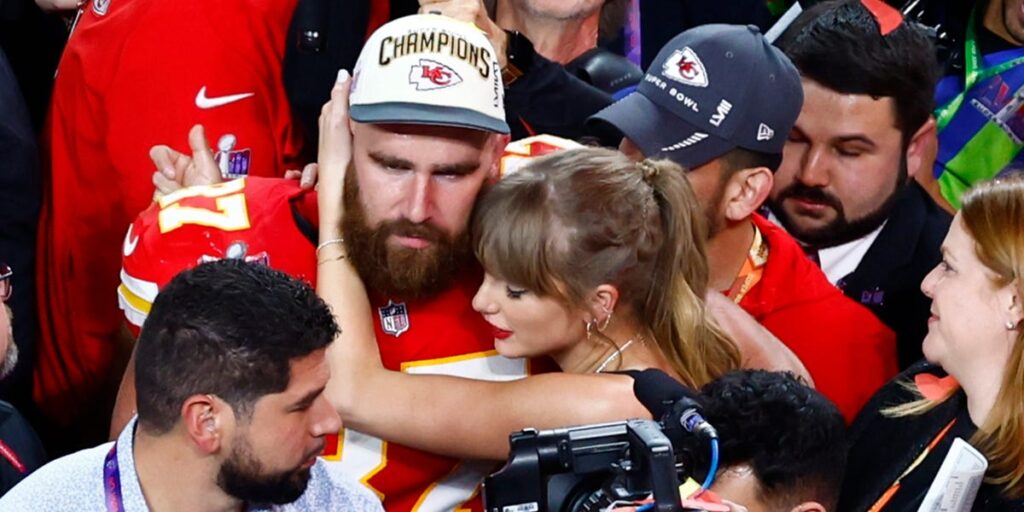 Taylor Swift and Travis Kelsey at the 2024 Super Bowl.