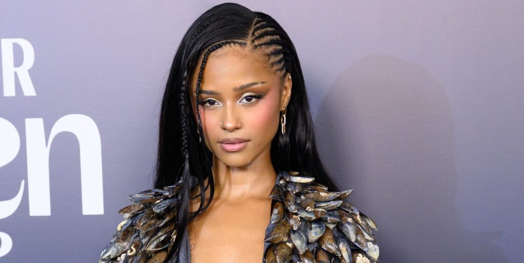 Tyra attended Glamor magazine’s Woman of the Year Awards in London wearing a George Trochopoulos look featuring a mussel shell jacket and shredded black skirt. Styled by Ron Hartleben, the South African pop star paired her bold ensemble with gold earrings and soft pink glamour. In her Glamor cover story, she opened up about her approach to beauty and style.
