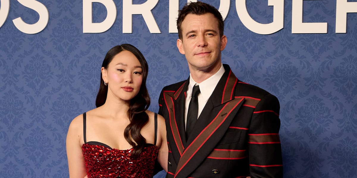 The pair attended a masquerade-themed press event for season 4 of the Netflix drama, posing side by side in complementary shades of red. Ha, who plays Sophie Bek opposite Thompson’s Benedict Bridgerton, wore a tight-fitting strappy dress covered in sparkling red embellishments. Thompson chose a black suit with brown stripes and red piping.
