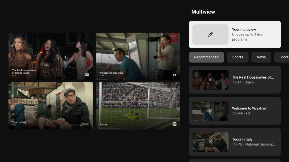 Multiview on YouTube TV, first introduced in March 2023, was previously limited to a preset list of sports and news channels. Multi-viewing on YouTube TV was initially limited to events like March Madness and NFL Sunday Ticket content. The service then launched several “always-on” multiviews: four preselected streams of news, business, and weather. Last year, YouTube TV began expanding multiview to include more content than just sports available on popular channels.